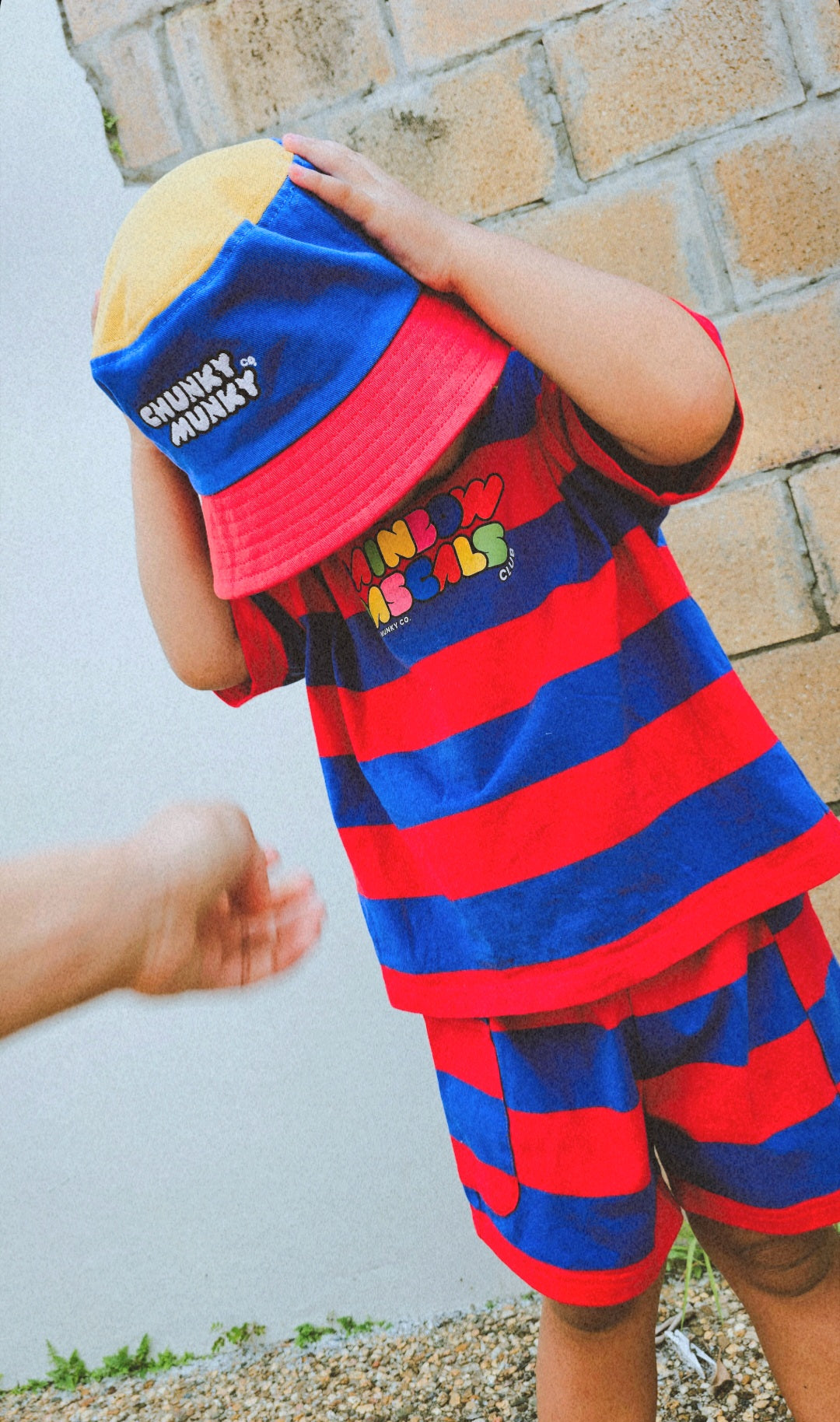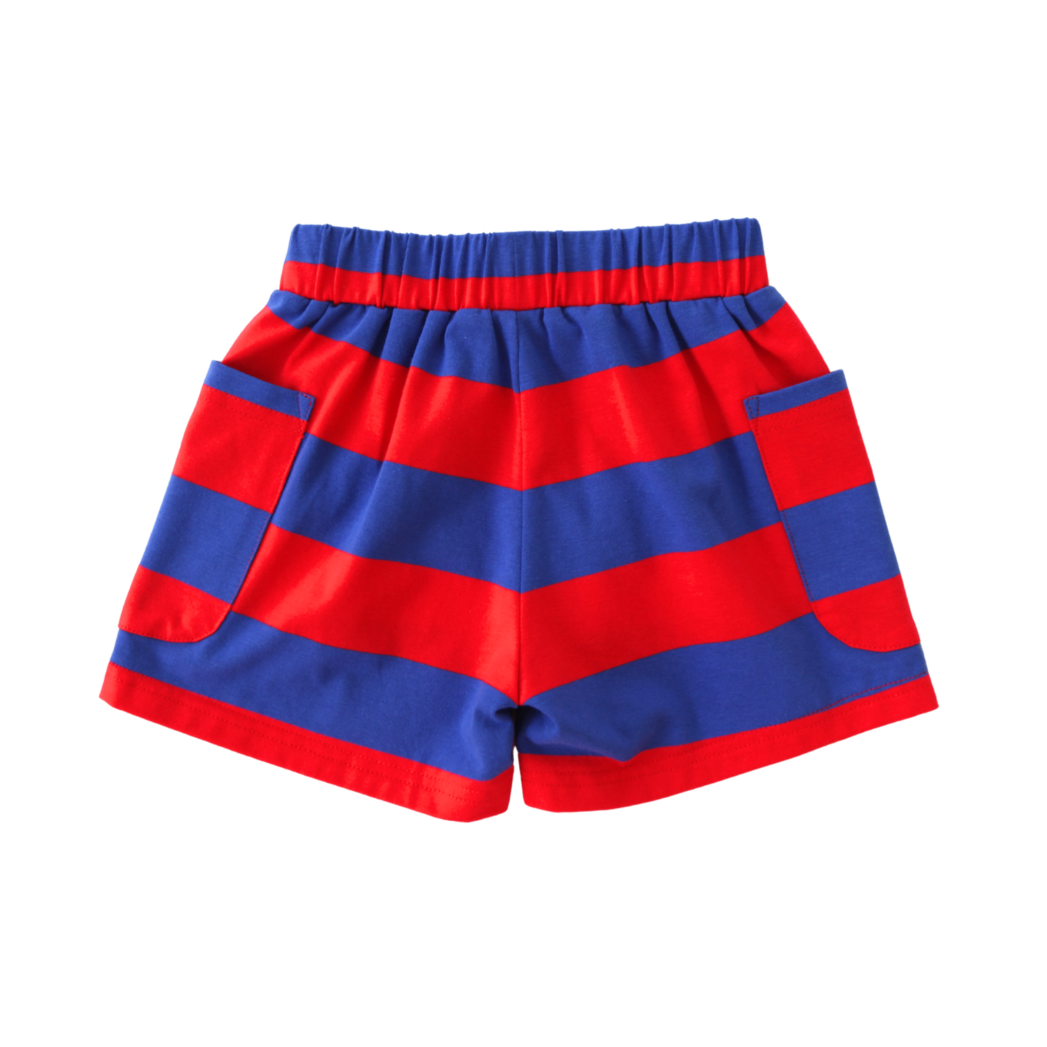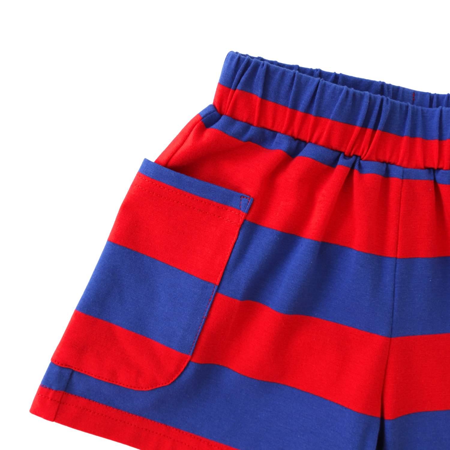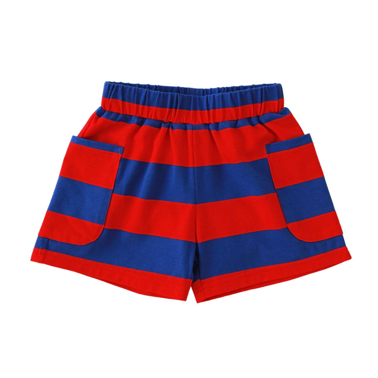 大胆なレッド×ブルーのストライプ、深めのポケット、そして思いっきり動ける伸縮性。